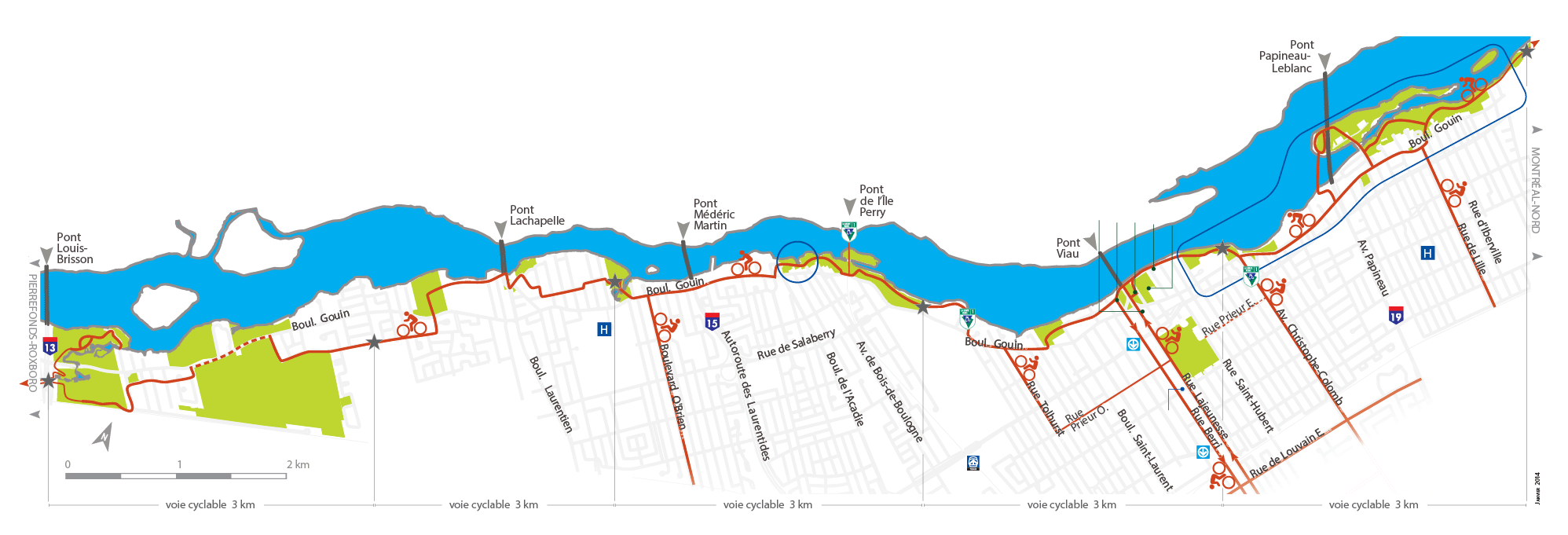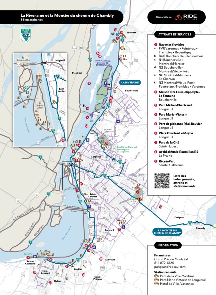 En longeant le fleuve Saint-Laurent et la 132 de Saint-Constant jusqu'à Varennes, La Riveraine permet de parcourir un environnement à la fois urbain et naturel, ponctué de parcs riverains, de points de vue sur Montréal et de lieux culturels et patrimoniaux.